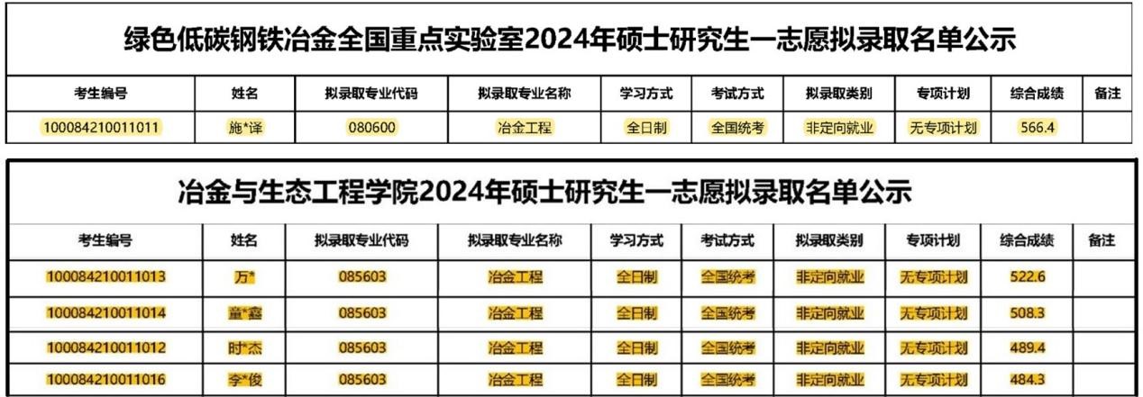 4月7日,北京科技大学公示了硕士研究生一志愿拟录取名单。据悉,材料学院冶金工程2020班一志愿报考北科大研究生且考研成绩超过国家线的5名学生,复试后全被录取,被录取的学生分别是施凯译(学硕)、万凯、童琪鑫、时军杰、李兆俊。其中,施凯译同学的综合成绩在“绿色低碳钢铁冶金全国重点实验室”拟录取名单中排名第一,万凯、童琪鑫同学的综合成绩在“冶金与生态工程学院”拟录取名单中名列前茅。刷新了冶金工程2018班被录取4人的最高记录。