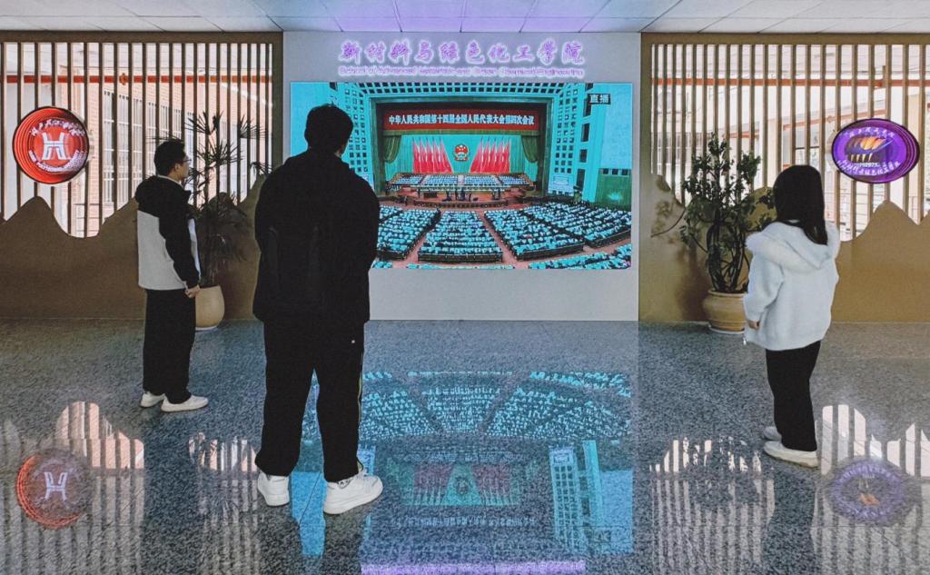 3月4日至12日两会直播期间,学院一楼大厅电子屏持续滚动播放两会新闻专题视频,聚焦科技创新、绿色低碳、新材料产业发展等核心议题,解读相关政策要点,实现国家发展战略与学院专业特色深度对接。来往师生纷纷驻足观看,围绕行业热点交流心得,这道“行走的两会学习风景线”让校园公共空间成为两会精神传播前沿阵地,为后续活动开展筑牢思想根基。