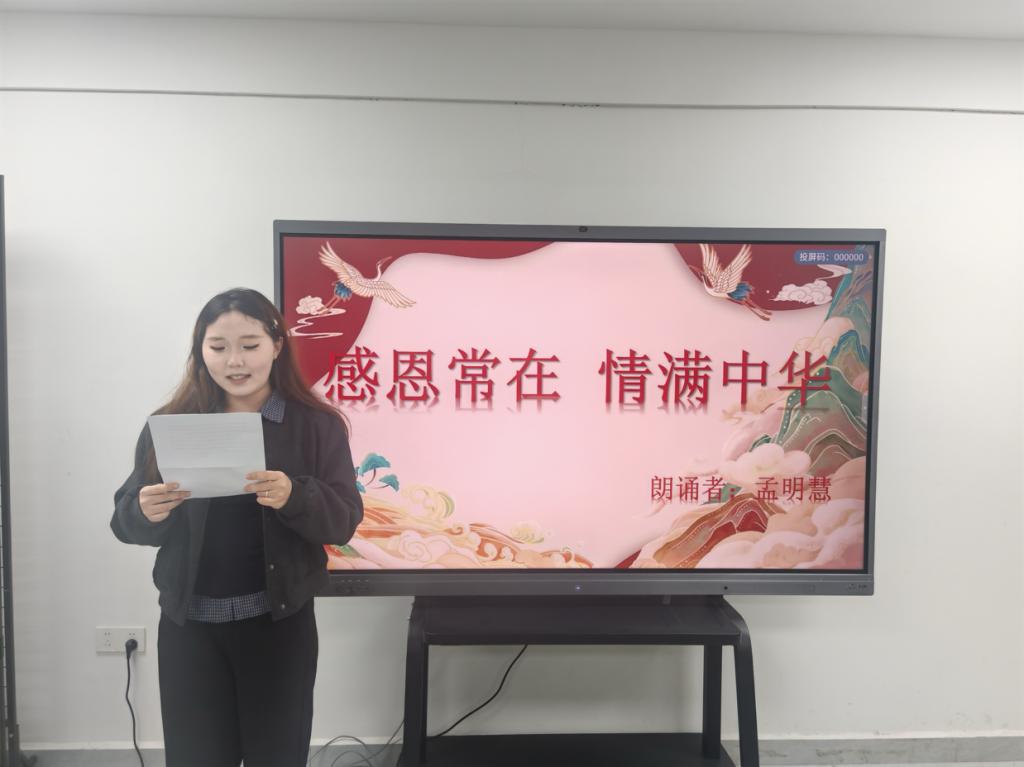 活动以听歌识曲小游戏拉开帷幕。比赛过程中,同学们以饱满的热情和真挚的情感,通过朗诵的形式表达了对祖国、父母、师长和生活的感恩之情。孟明慧同学满怀激情,以一首《感恩常在,情满中华》的朗诵将对祖国的热爱、对民族团结的赞美以及对中华文化的自豪之情展现得淋漓尽致;文儒生同学通过一首《感恩父母,点亮生命的烛光》的朗诵,表达了对感恩父母日夜辛劳养育我们的感恩之情,让听众更加深切地感受到父母的爱;赵雅素、黄芷莹同学以《恩师长歌》朗诵表达了对老师的感恩之情,感谢老师们的辛勤付出和默默陪伴......