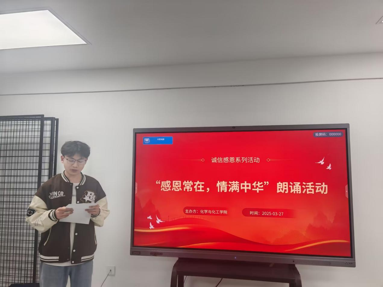 为弘扬中华民族传统美德,增强同学们的感恩意识,提升语言表达能力,化学与化工学院于3月27日在求实一站式学生社区102举办“感恩常在,情满中华”朗诵比赛。