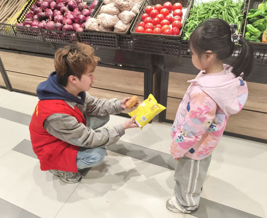 在超市里,志愿者们根据所学专业知识耐心向居民解读各类食品的标签标识,帮助居民选购营养安全的食品,维护健康生活。这一活动,促进了青年学子将专业知识学以致用,也向公众普及了健康知识。