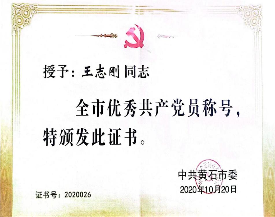 7、2020年6月获得中共黄石市委人才工作领导小组办公室、黄石市科学技术协会授予“黄石青年科技工作者”荣誉称号